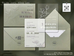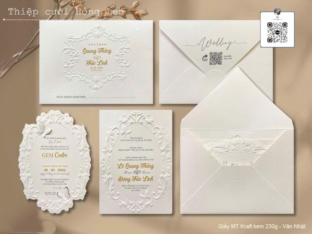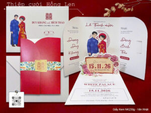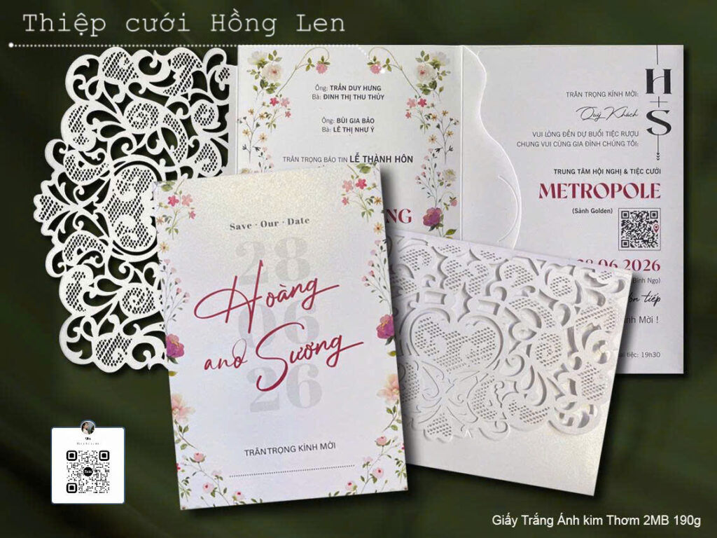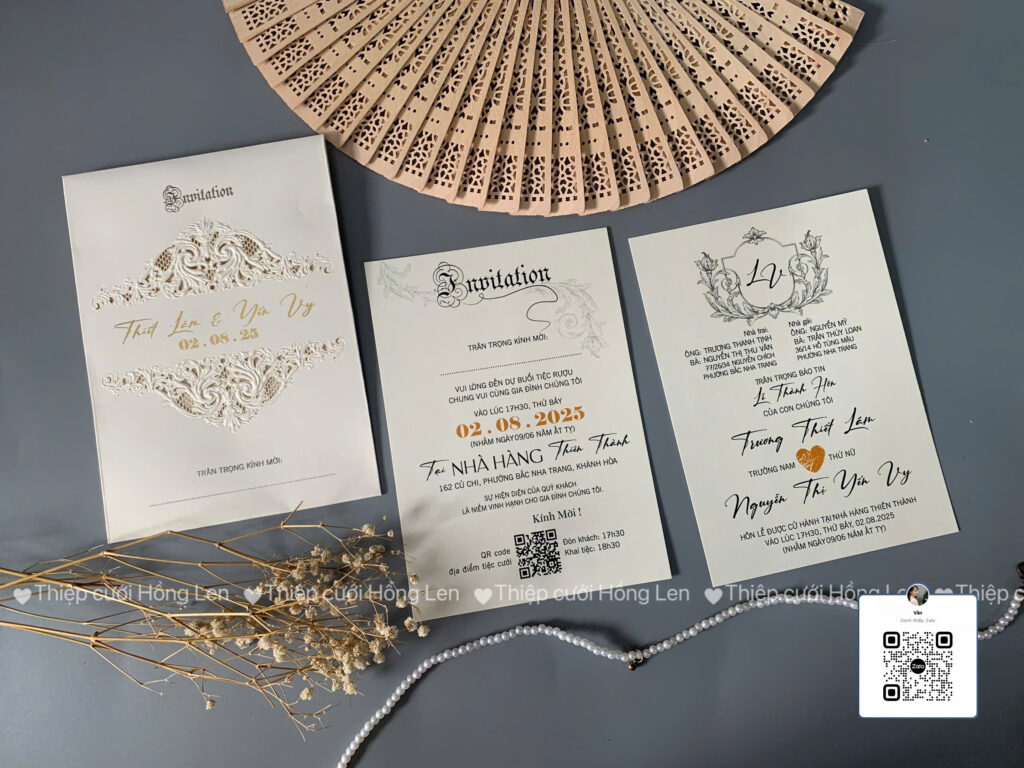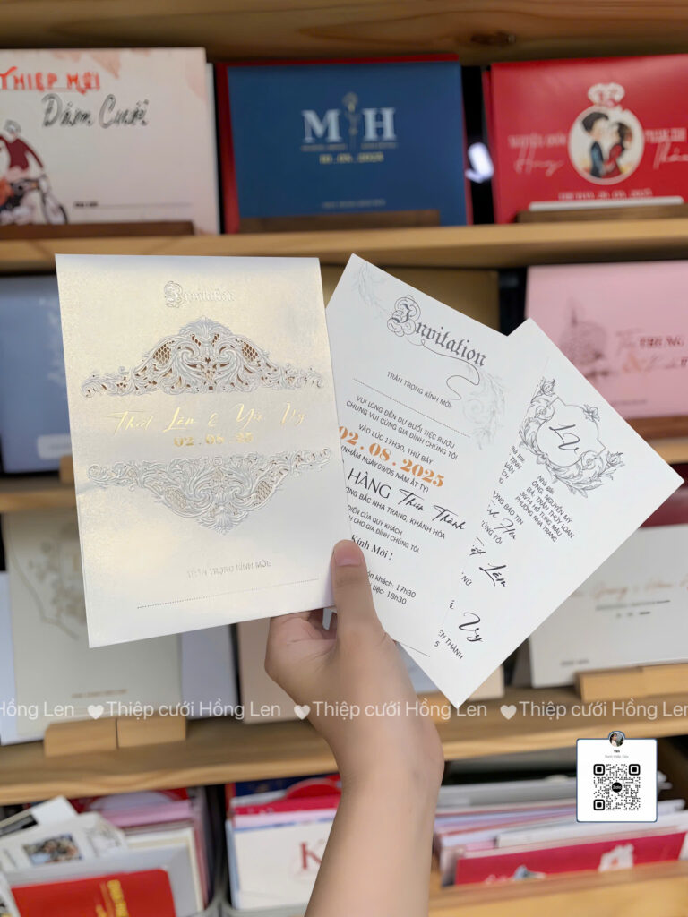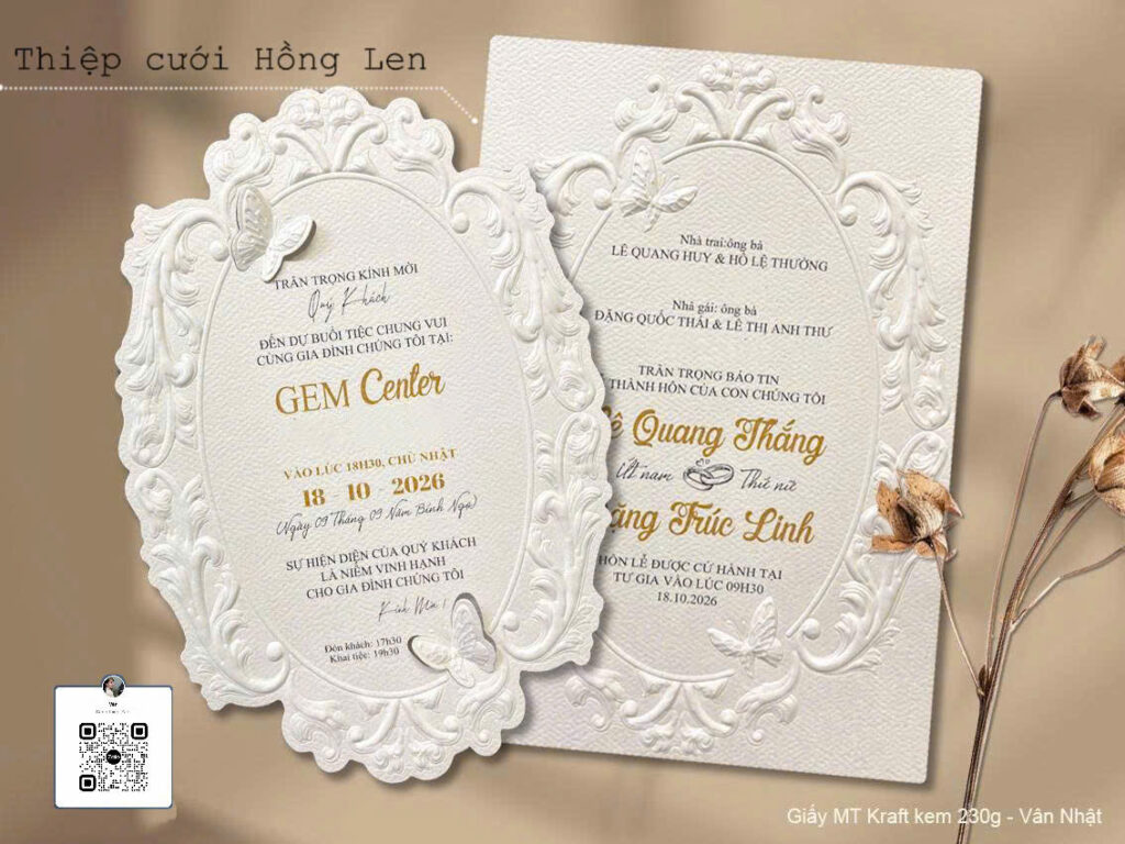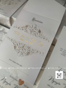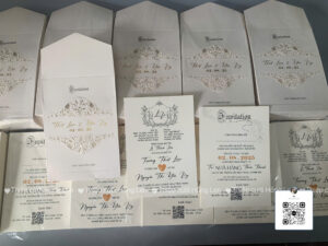 Thiệp sử dụng giấy mỹ thuật kết hợp các kỹ thuật ép kim, in lún, ép lún, bế nổi 2D, bế nổi 3D, cắt laser, nội dung in bằng máy in laser màu
