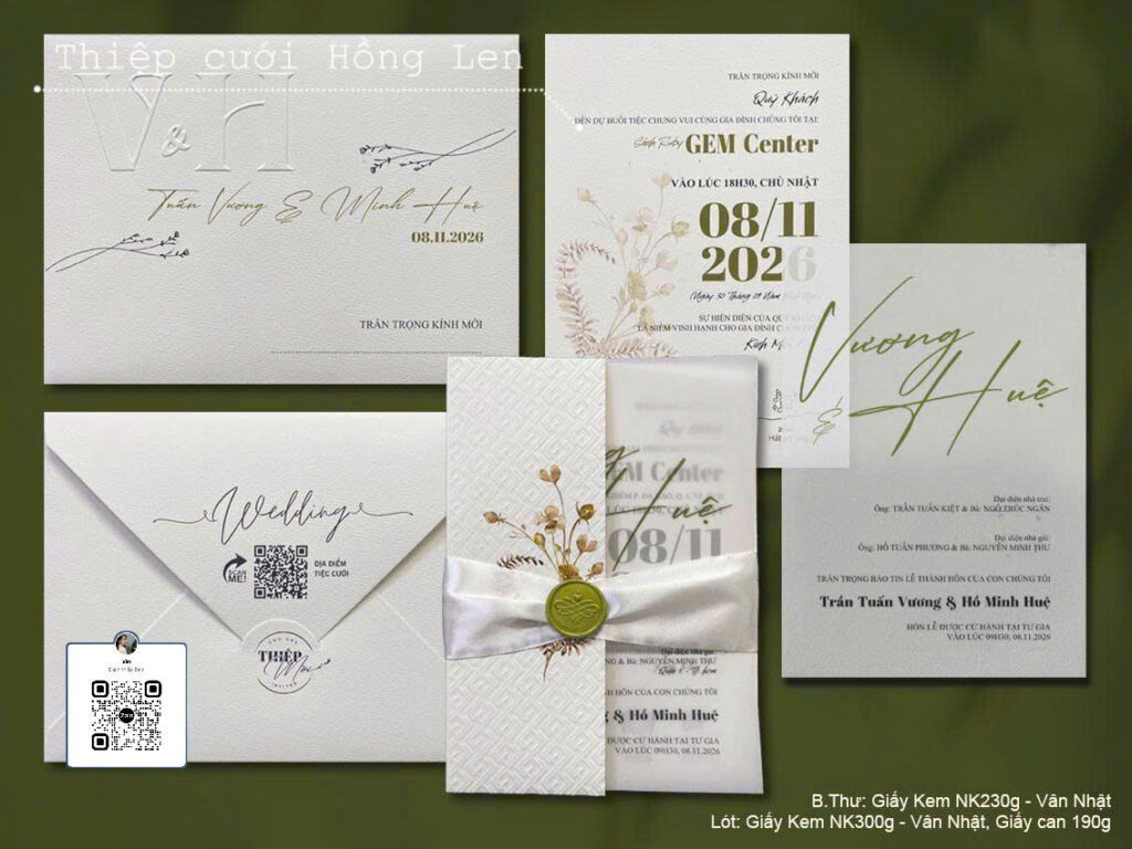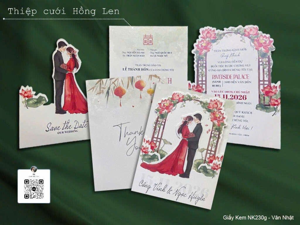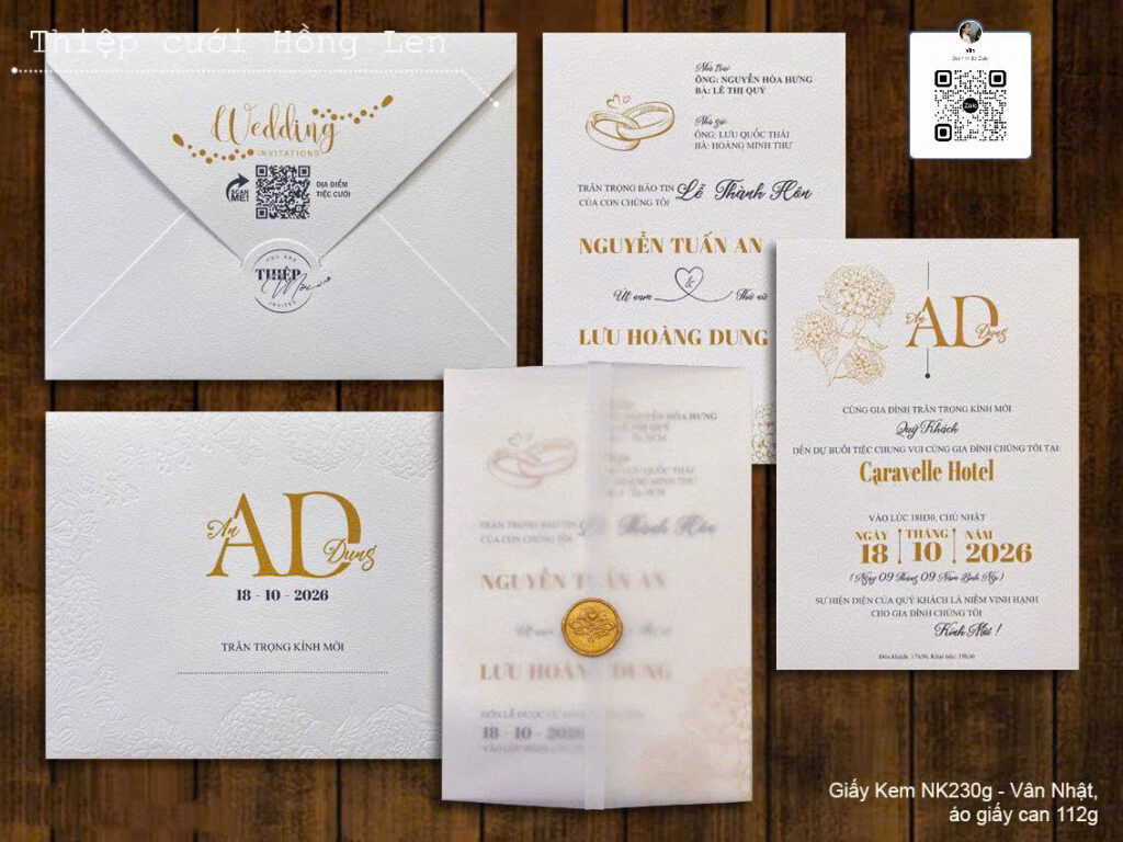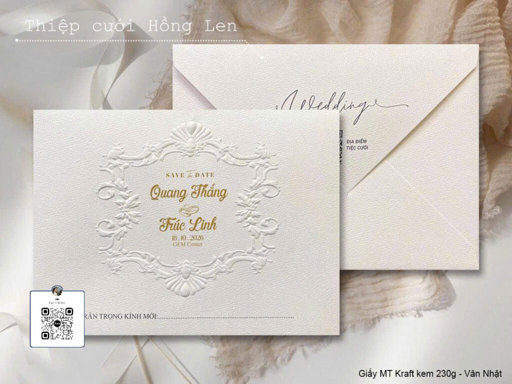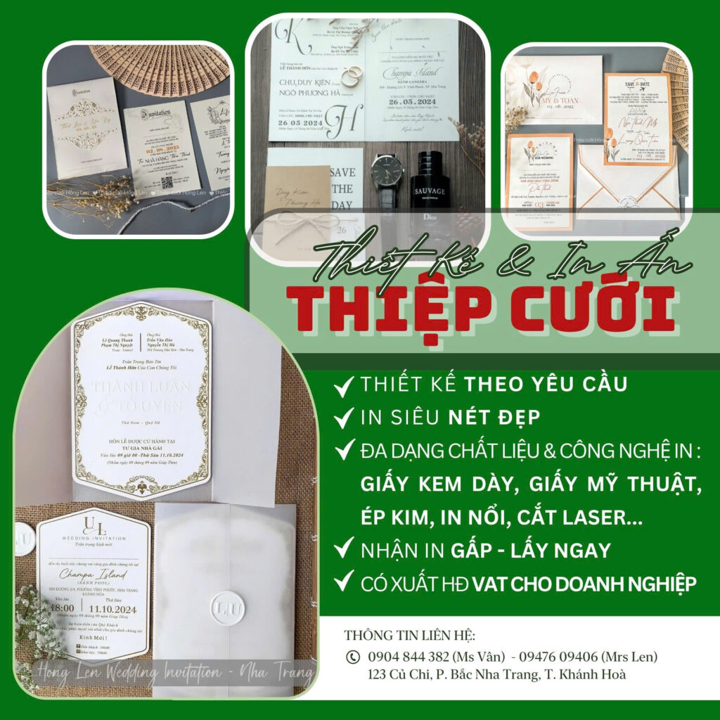 Thiệp sử dụng giấy mỹ thuật kết hợp các kỹ thuật ép kim, in lún, ép lún, bế nổi 2D, bế nổi 3D, cắt laser, nội dung in bằng máy in laser màu