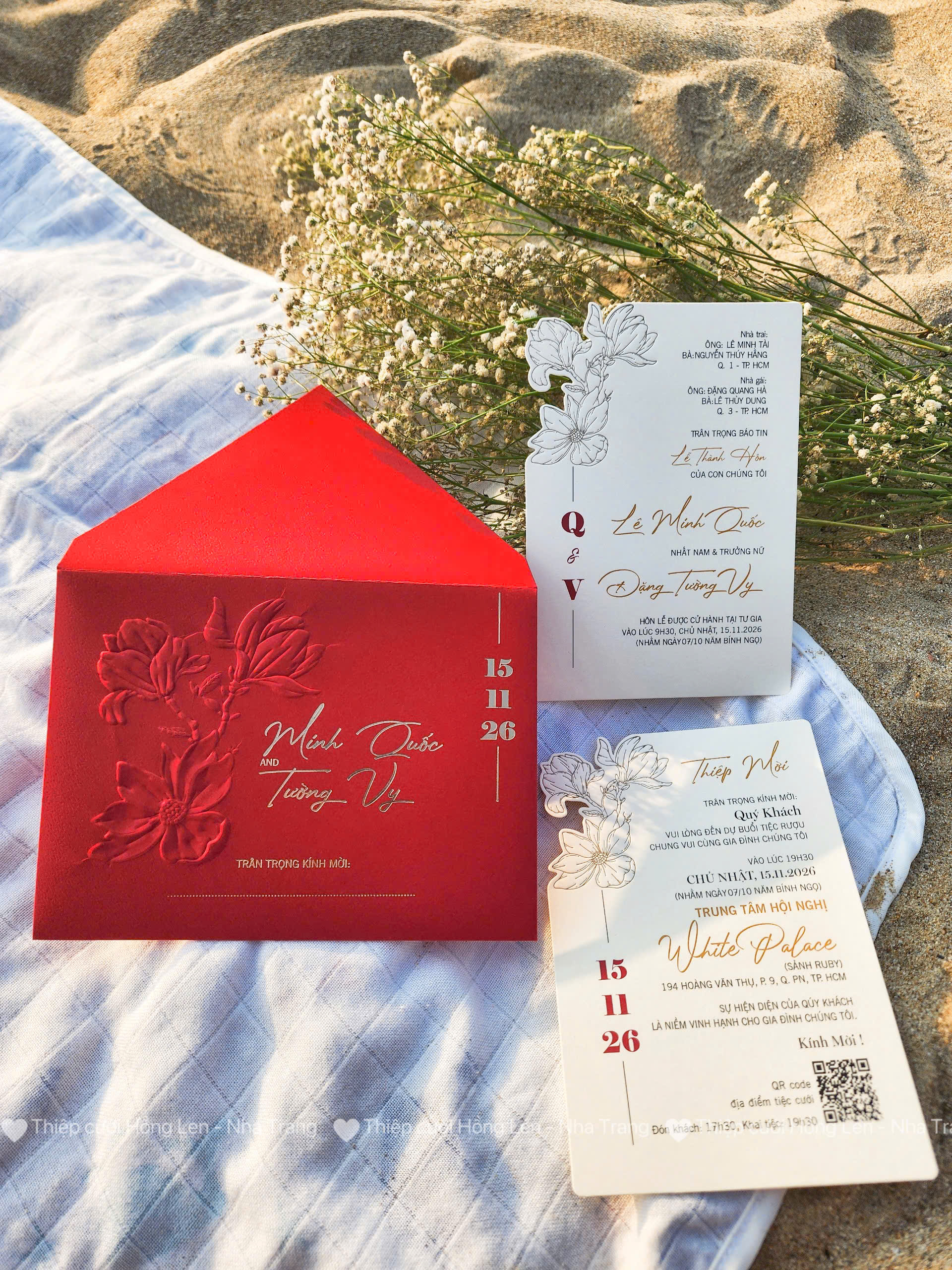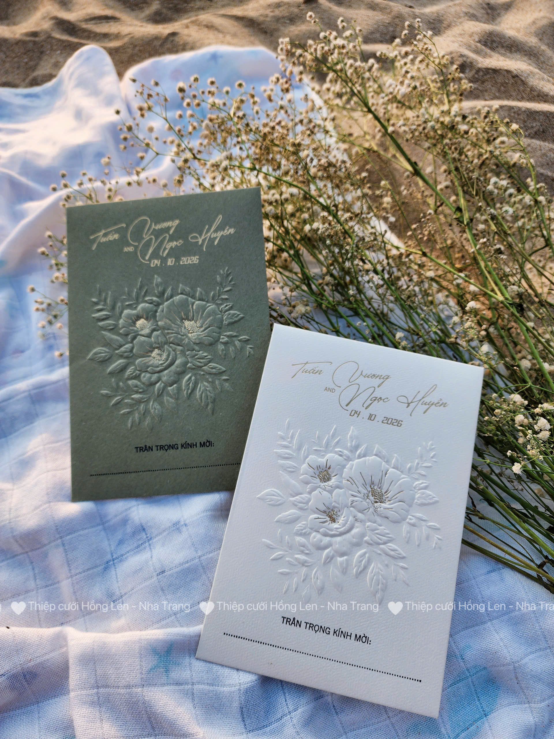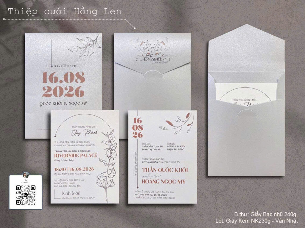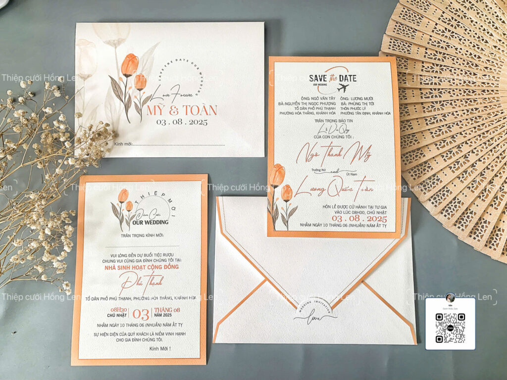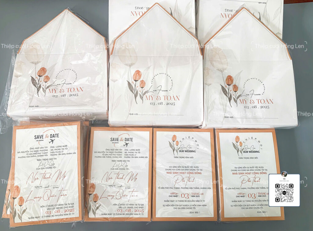 Thiệp sử dụng giấy mỹ thuật kết hợp các kỹ thuật ép kim, in lún, ép lún, bế nổi 2D, bế nổi 3D, cắt laser, nội dung in bằng máy in laser màu